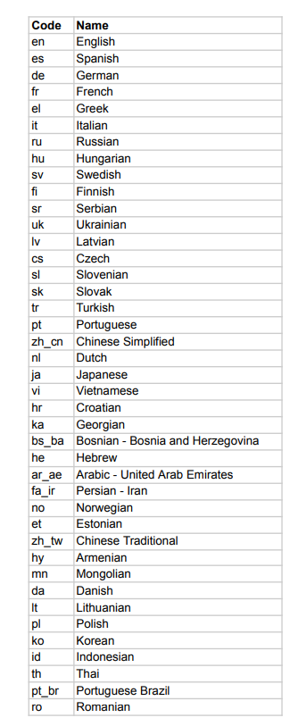 מהם הקודים עבור שפות הממשק, בהם נעשה שימוש בייבוא לומדים?